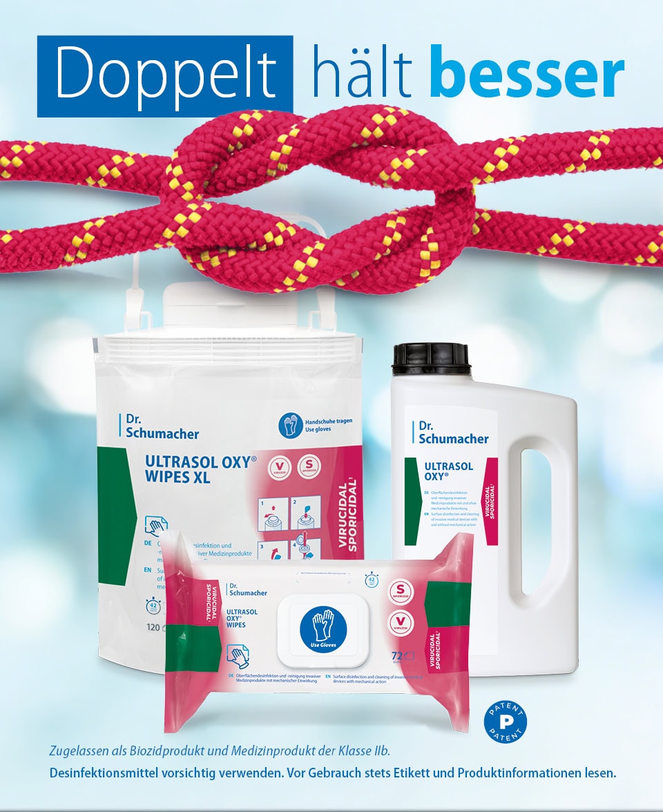 Mit der ULTRASOL OXY® Familie bietet Dr. Schumacher eine Produktreihe auf Basis der Wirkstoffe Peressigsäure und Wasserstoffperoxid. Bakterizid, levurozid, tuberkulozid, mykobakterizid, sporizid, fungizid und viruzid (gem. aktueller EN-Normen) – die Produktfamilie bietet ein sehr breites Wirkungsspektrum² und ist damit einsetzbar sowohl für die Routinedesinfektion als auch im Ausbruchsfall. Die oxidative Basis führt zu einer hohen Materialverträglichkeit und Produktkompatibilität und macht die Anwendung in Kombination mit den kurzen Einwirkzeiten³ schnell und effizient. Mit dieser Produktlösung entspricht Dr. Schumacher auch anspruchsvollen Hygiene- und Umweltstandards und ist für Einsatzbereiche von der Routine bis zu sensiblen medizinischen Anwendungen geprüft.