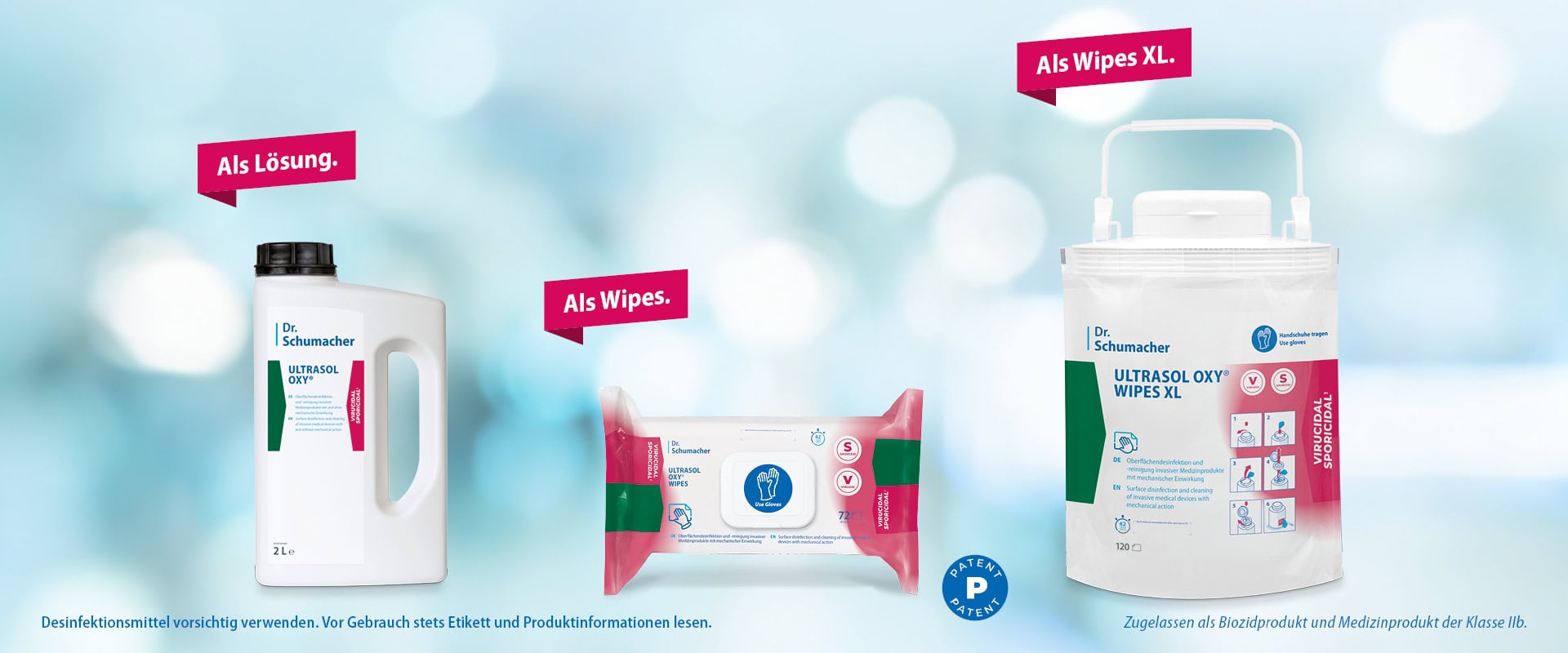 ULTRASOL OXY passt sich an: als gebrauchsfertige Flüssigdesinfektion und als vorgetränkte Tücher in zwei Größen.