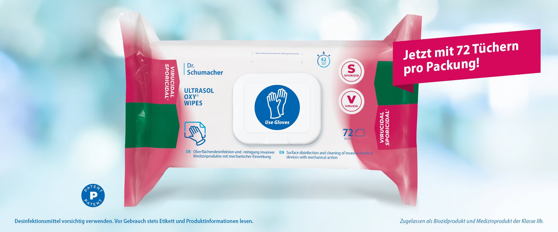 Im Zuge einer Optimierung des Produktionsprozesses wurde zugleich eine angepasste Verpackungsgröße umgesetzt, die den vielfach geäußerten Anwenderwünschen entgegenkommt: ULTRASOL OXY WIPES sind ab sofort mit 72 statt 108 Tüchern pro Packung erhältlich. Der Preis pro Tuch bleibt unverändert.